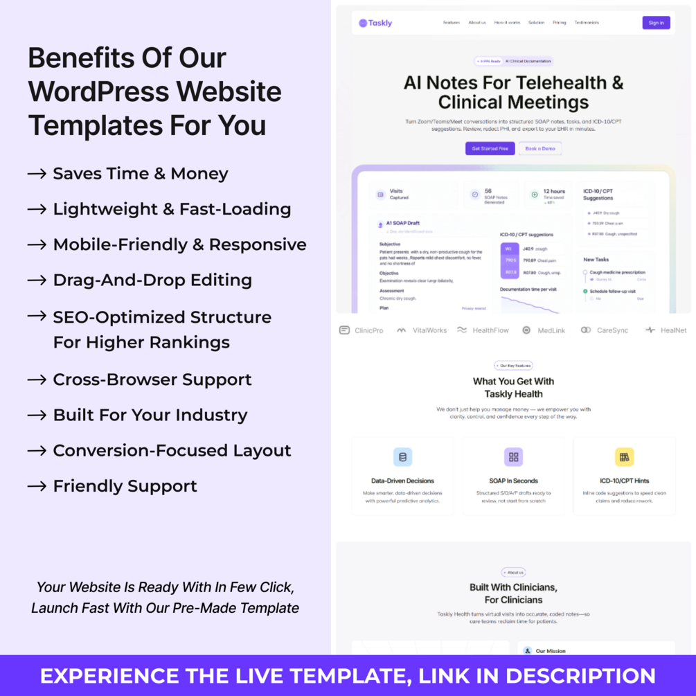 Introduce your SaaS product with "Taskly," a premium WordPress landing page template designed specifically for Elementor. This template is engineered to provide a credible, high-converting digital storefront for AI-powered applications, particularly AI note-takers, transcription services, and productivity tools. Its clean, tech-focused aesthetic and strategic layout will help you build trust and drive user sign-ups from day one.