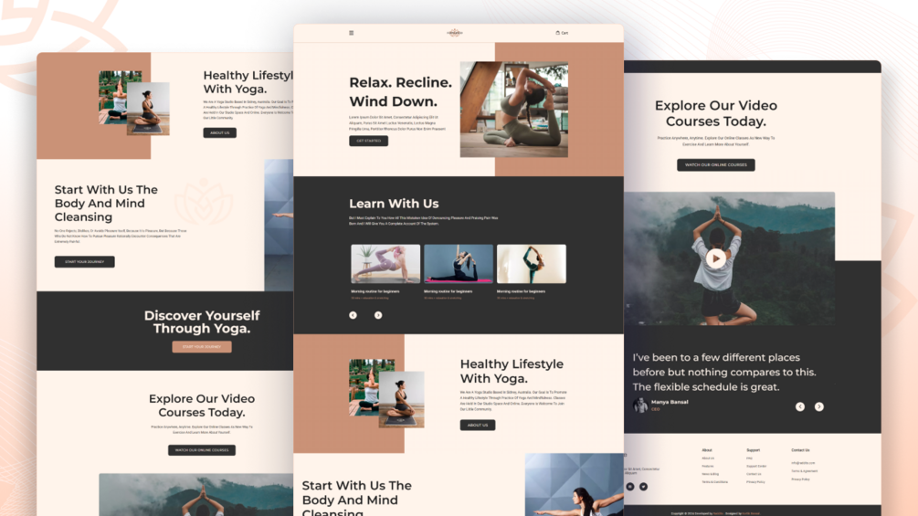 - 2. Core Classes / Services Showcase: A clean, three-column card-based section to visually present your main offerings, such as "Young Adult Yoga," "Vinyasa Yoga," and other fitness programs.