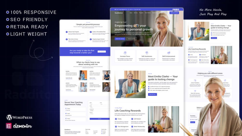 This WordPress landing page template is the ultimate solution for life coaches, personal development mentors, business coaches, and consulting service providers. Built with the powerful and intuitive Elementor Pro Page Builder, this template gives you everything you need to create a professional, high-converting website that attracts new clients and helps your business grow.