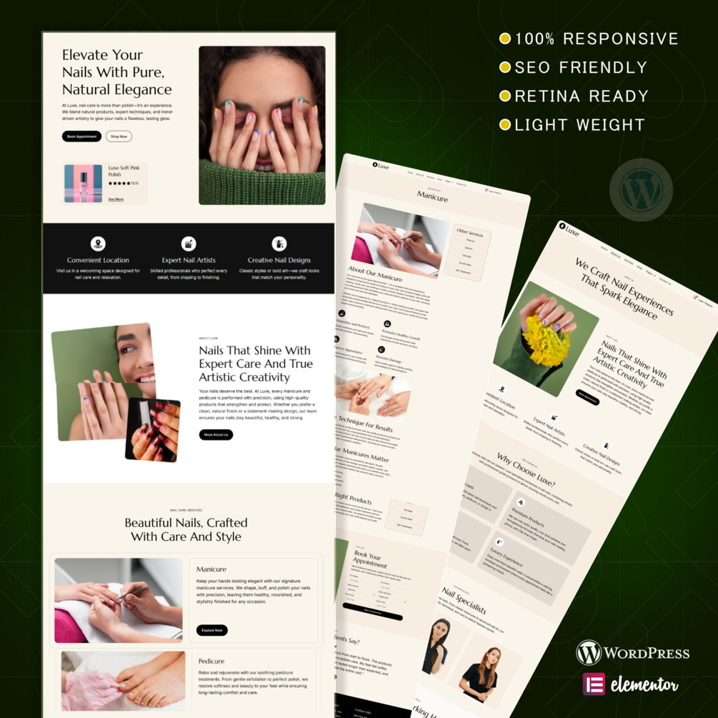This premium Nail and Beauty Salon WordPress Template Kit, designed exclusively for Elementor Pro and WooCommerce, is the ultimate solution for any spa, makeup artist, or modern parlour. This fast-loading, SEO-friendly, and fully responsive template kit provides a sophisticated digital platform to showcase your beauty services, sell products online, and streamline client bookings through a stunning, conversion-focused website.