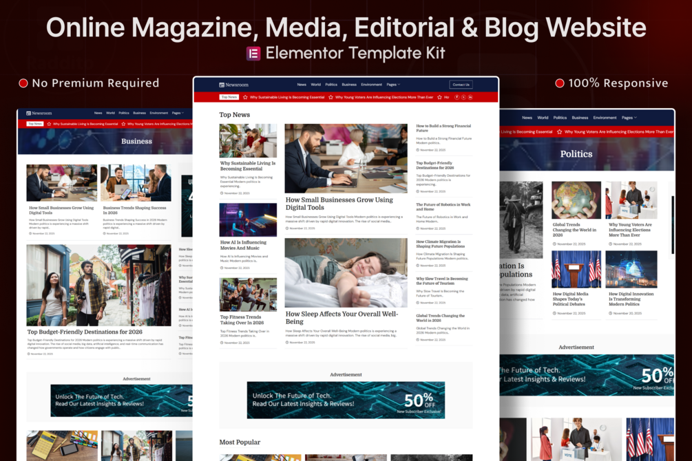 This News WordPress Elementor template kit is designed for online magazines, news portals, media outlets, editorial blogs, journalists, publishers, and content creators who need a modern, content-focused website built with Elementor Free.