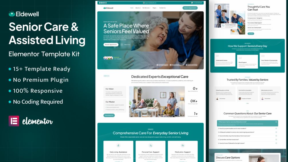 This Senior Care WordPress Elementor template kit is designed for assisted living facilities, elder care centers, nursing homes, and senior healthcare providers who need a warm, trustworthy, and professional website built with Elementor Free.