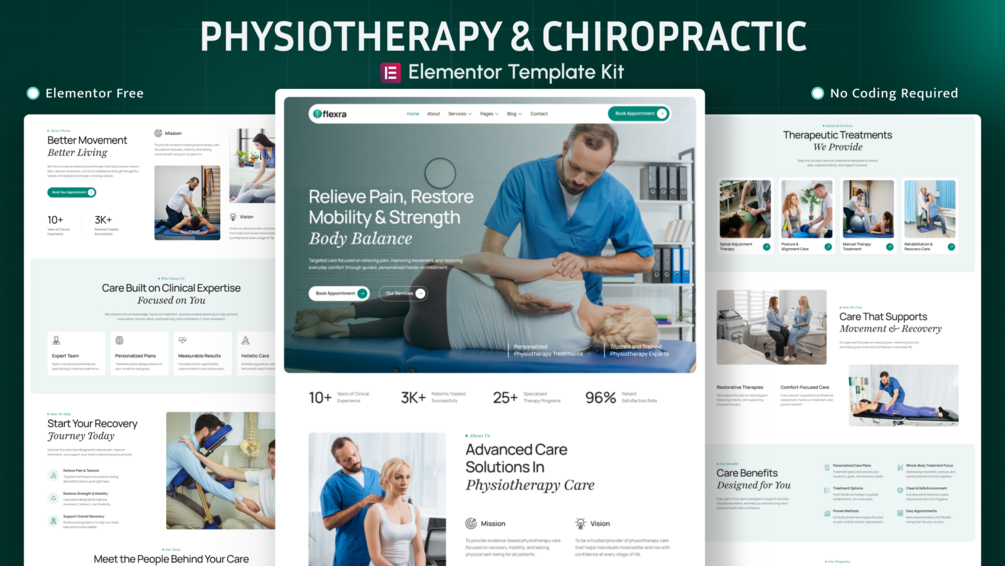 The template kit helps health and wellness providers clearly present services, explain treatment approaches, and guide visitors toward booking appointments or making contact. It is ideal for anyone looking to build a therapy, chiropractic, counseling, or wellness website on WordPress without using Elementor Pro or paid plugins.